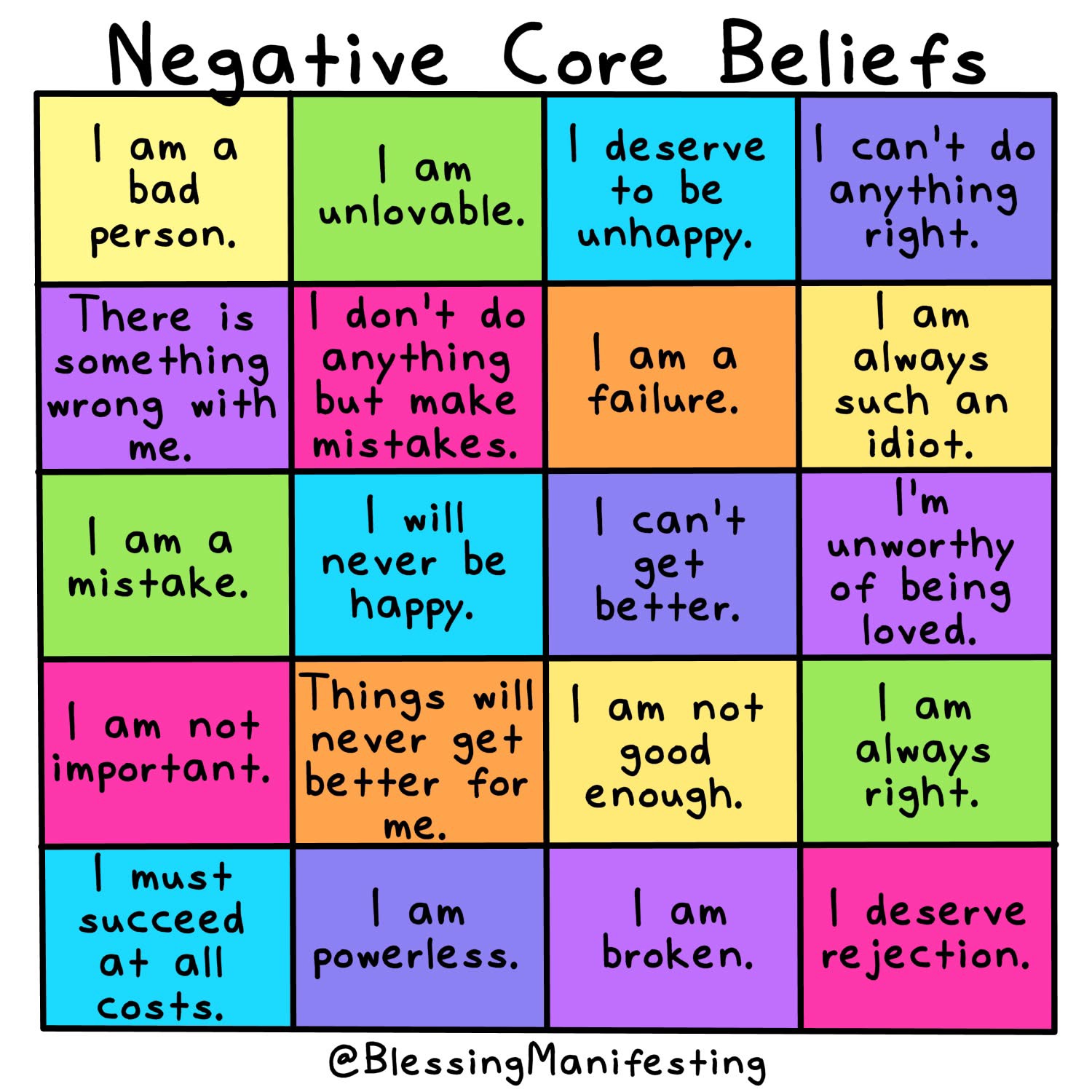 🔸 These kinds of thoughts are what we call negative core beliefs. They’re the deep-down messages we carry about ourselves, and even though they don’t always make sense, they can end up running the show.